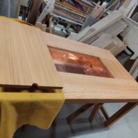 古民家再生協会の小野寺です。 現在改修中の古民家で、和室の掘りごたつに合わせて造作の囲炉裏テーブルを製作しました。 建具職人による木製の天板に、板金職人が製作した銅板の火入れ部を組み合わせたもので、銅の熱伝導性や耐久性を …